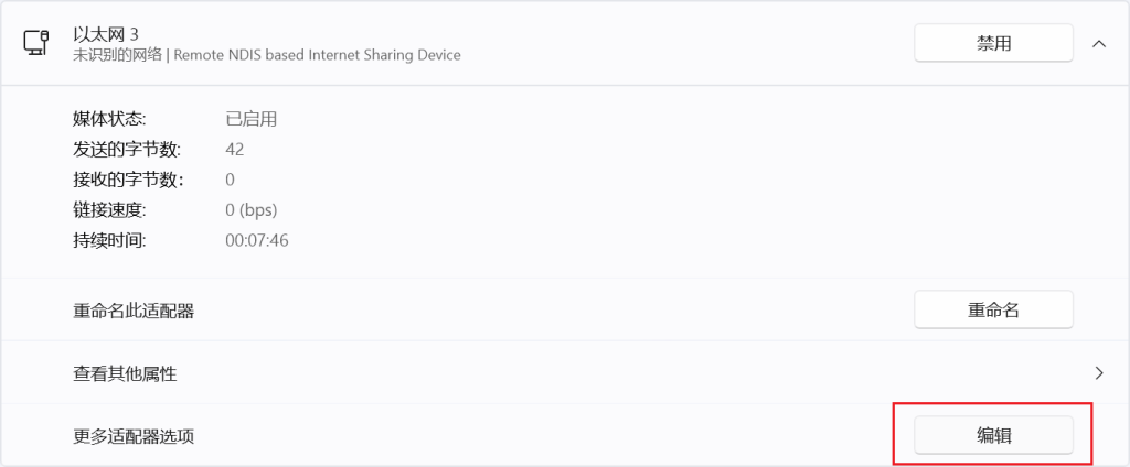1、打开设置—>高级网络设置,找到RNDIS设备,如图: