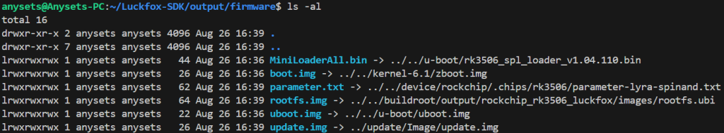 编译生成的文件存放在/SDK目录/output/firmware中,且全部为符号链接,使用ls -al可以显示具体的链接位置: