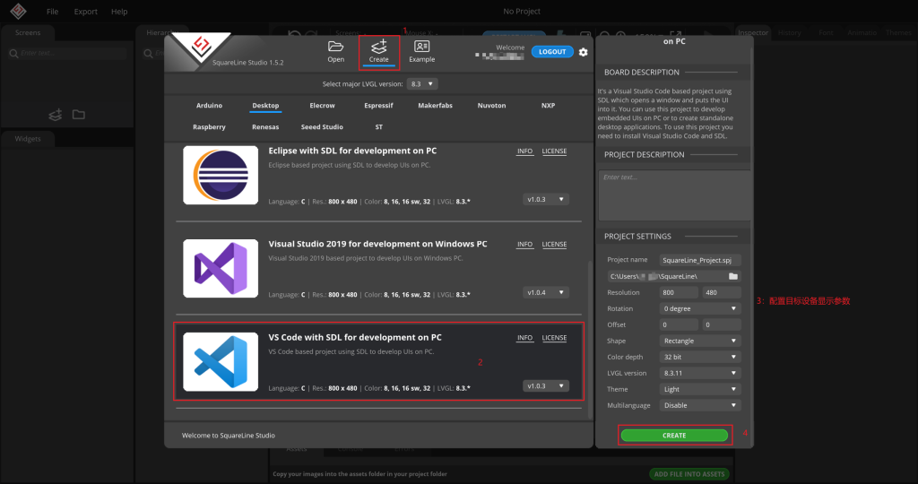 打开SquareLine Studio,选择VSCode with SDL for development on PC,然后配置好目标设备的参数,新建工程即可。
